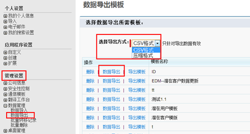 數據批量導出是CRM數(shu)據(ju)批(pi)量(liang)化(hua)處(chu)理(li)的(de)重(zhong)要(yao)內(nei)容(rong)。用(yong)戶(hu)可(ke)以(yi)通(tong)過(guo)管(guan)理(li)設(she)置(zhi)中(zhong)的(de)數(shu)據(ju)管(guan)理(li)對(dui)係(xi)統(tong)中(zhong)標(biao)準(zhun)對(dui)象(xiang)及(ji)自(zi)定(ding)義(yi)對(dui)象(xiang)的(de)數(shu)據(ju)進(jin)行(xing)導(dao)出(chu),係(xi)統(tong)提(ti)供(gong)自(zi)定(ding)義(yi)導(dao)出(chu)和(he)按(an)模(mo)板(ban)導(dao)出(chu)多(duo)種(zhong)導(dao)出(chu)方(fang)式(shi),並(bing)提(ti)供(gong)CSV、壓縮兩種格式。