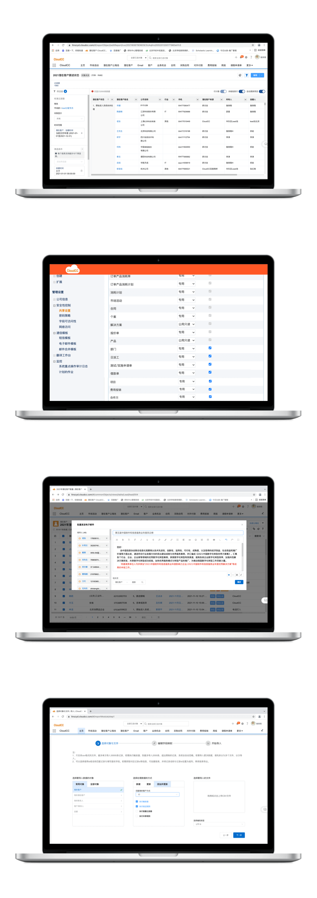 使用CloudCC.com 雲yun平ping台tai,用yong戶hu可ke直zhi接jie通tong過guo瀏liu覽lan器qi在zai互hu聯lian網wang上shang創chuang建jian和he運yun行xing應ying用yong程cheng序xu而er無wu需xu安an裝zhuang任ren何he插cha件jian,並bing可ke將jiang企qi業ye應ying用yong進jin行xing拓tuo展zhan,不bu僅jin僅jin是shi銷xiao售shou環huan節jie的de應ying用yong,而er是shi能neng夠gou支zhi持chi所suo有you類lei型xing的de業ye務wu,例li如ru:物流運輸、進銷存、供應鏈、財務管理、人力資源、日常辦公等。