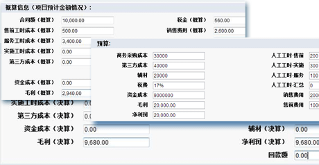銷xiao售shou項xiang目mu從cong商shang機ji到dao項xiang目mu執zhi行xing完wan畢bi整zheng個ge過guo程cheng的de追zhui蹤zong,其qi間jian的de費fei用yong,成cheng本ben,人ren工gong全quan部bu實shi時shi核he算suan到dao項xiang目mu上shang,對dui項xiang目mu的de概gai算suan,預yu算suan,決jue算suan統tong一yi管guan理li。幫bang助zhu公gong司si經jing營ying者zhe和he項xiang目mu管guan理li者zhe及ji時shi的de對dui項xiang目mu成cheng本ben的de合he理li性xing、有效性進行掌控。