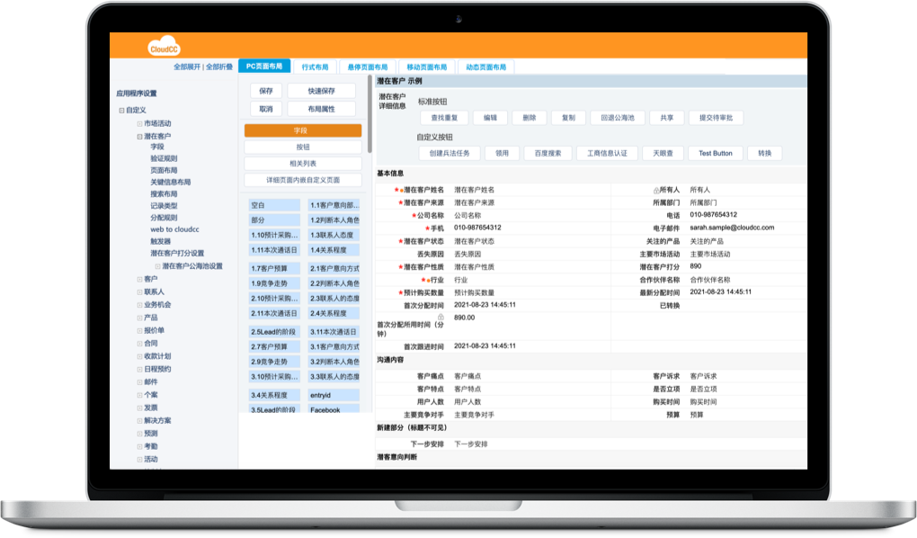 CloudCC CRM在線CRM 解決方案,基本的自定義操作將變得十分輕鬆容易,因此,企業用戶隻需通過點擊式界麵即可在短短數分鍾之內進行更改。
