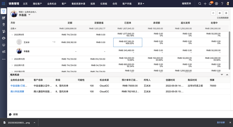 ○ 最後係統根據X公司季度預測的周期,設定了每一位銷售的季度銷售任務,通過銷售預測看板,X公(gong)司(si)的(de)銷(xiao)售(shou)總(zong)監(jian)直(zhi)觀(guan)且(qie)清(qing)晰(xi)地(di)掌(zhang)握(wo)了(le)目(mu)前(qian)所(suo)有(you)銷(xiao)售(shou)團(tuan)隊(dui)以(yi)及(ji)每(mei)一(yi)位(wei)銷(xiao)售(shou)代(dai)表(biao)的(de)業(ye)績(ji)預(yu)測(ce)情(qing)況(kuang)。通(tong)過(guo)銷(xiao)售(shou)預(yu)測(ce)看(kan)板(ban),能(neng)夠(gou)及(ji)時(shi)了(le)解(jie)到(dao)銷(xiao)售(shou)是(shi)否(fou)有(you)足(zu)夠(gou)的(de)商(shang)機(ji)支(zhi)撐(cheng)其(qi)未(wei)來(lai)一(yi)段(duan)時(shi)間(jian)的(de)銷(xiao)售(shou)業(ye)績(ji)達(da)成(cheng)。也(ye)能(neng)夠(gou)看(kan)到(dao)支(zhi)撐(cheng)每(mei)個(ge)預(yu)測(ce)類(lei)別(bie)的(de)具(ju)體(ti)商(shang)機(ji)有(you)哪(na)些(xie),通(tong)過(guo)跟(gen)深(shen)入(ru)了(le)解(jie)這(zhe)些(xie)商(shang)機(ji)的(de)情(qing)況(kuang),銷(xiao)售(shou)總(zong)監(jian)有(you)了(le)一(yi)個(ge)總(zong)體(ti)的(de)判(pan)斷(duan),哪(na)些(xie)銷(xiao)售(shou)比(bi)較(jiao)保(bao)守(shou),哪(na)些(xie)銷(xiao)售(shou)比(bi)較(jiao)樂(le)觀(guan)。