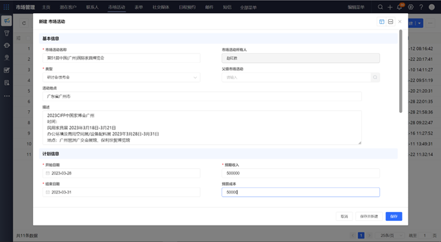 製定活動計劃 第一步:創建市場活動 通用家居市場部計劃參加第51屆中國廣州國際家具博覽會,並通過CloudCC CRM記錄整個市場活動過程以便於活動結束後做投資回報率分析。市場專員首先需要在係統中記錄市場活動計劃信息,進入CloudCC CRM中選擇“市場活動”菜單,填寫市場活動計劃內容,包括市場活動名稱、類型、地點、時間、描述,以及預期收入和預算成本等信息。