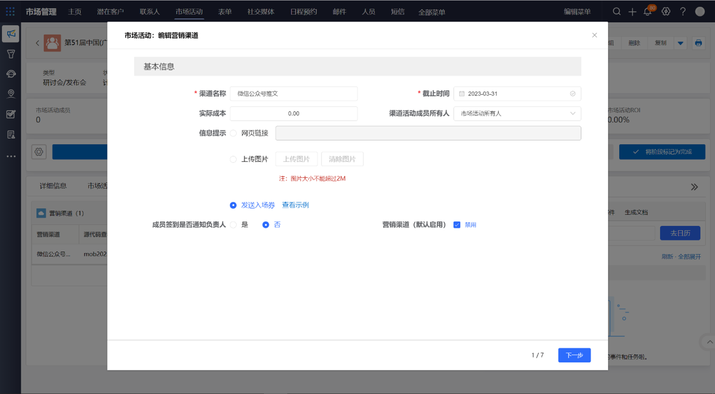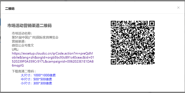 第三步:添加營銷渠道 通用家居市場部還想通過此次活動獲得一些潛在客戶,並會通過多種渠道宣發活動,如微信公眾號、員工邀約、 廣告投放等。此時市場專員可在係統中選擇名稱為“第51屆中國(廣州)國際家具博覽會”的市場活動記錄,選擇“市場活動營銷渠道” 相關列表來添加營銷渠道,完成營銷渠道對應的配置後,係統根據配置生成二維碼。此二維碼可下載後用來製作宣傳海報, ganxingquderenyuankesaomayuyuebaomingcanjiahuodong。baomingchenggonghou,zaixitongzhongzidongtongshishengchengshichanghuodongchengyuanjiqianzaikehujilu,tongyongjiajushichangbudadaohuoquqianzaikehudemude。