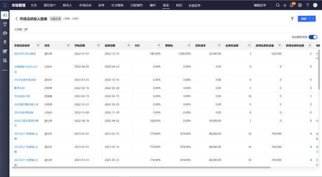 市場專員可隨時進入係統查看此次市場活動的統計數據,如獲得的潛在客戶數量、業務機會數量、業務機會金額、贏單的業務機會金額、投資回報率(ROI)等。