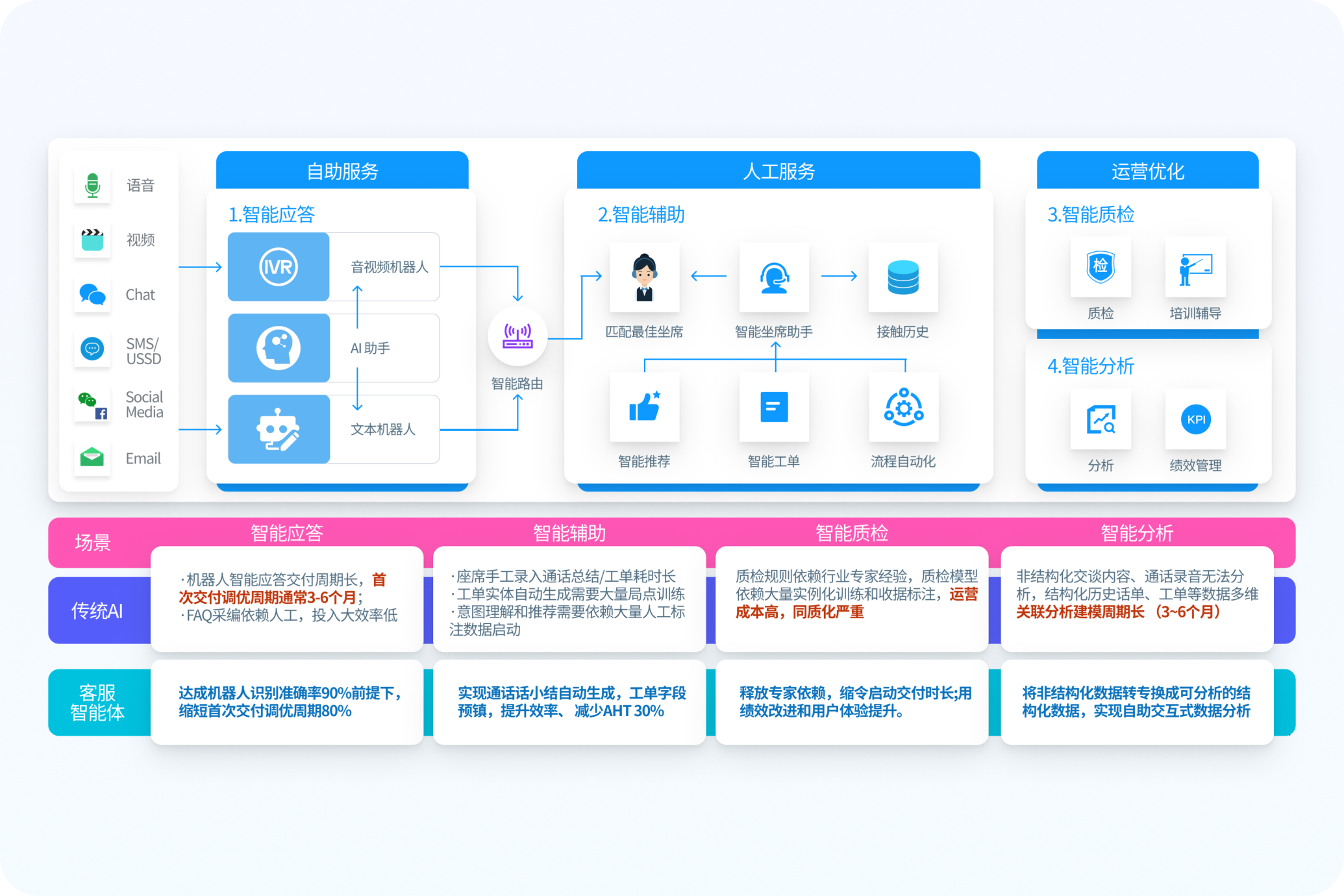 • 在線客服助手: 支持電話、郵件、IM等多渠道輸入,由AI參與並增強實時解析客戶意圖,推薦回複話術,生成服務總結和摘要,提升客服工作效率和質量