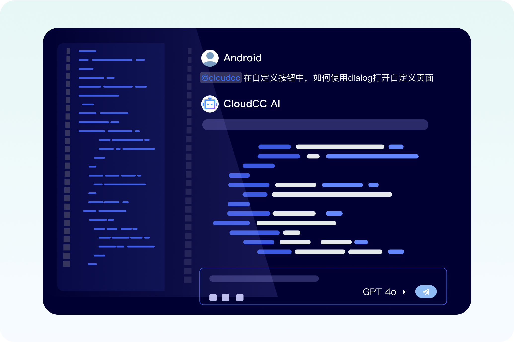 • 借助CloudCC 開發者智能體,讓應用開發更便捷。工程師能夠通過對話式的交互方式,智能生成代碼,讓應用的構建過程變得簡單高效、這讓開發人員可以更加專注於創意與創新的探索。 AI與CloudCC低代碼平台深度融合,用戶可以按需打造屬於自己的機器人,形成自然語言理解→流程建模→對象生成→動態優化的閉環。