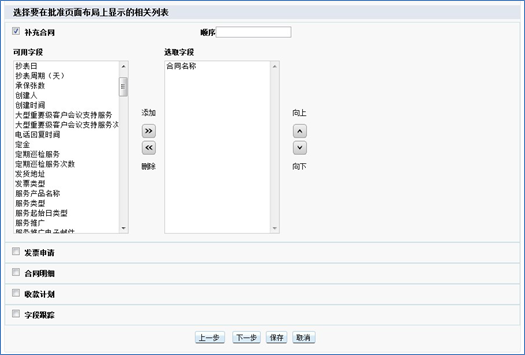 1、設置批準頁麵--進入批準過程詳細頁麵,點擊批準規則設置第5步,即批準頁麵布局,進入批準頁麵布局頁麵,選擇要在批準頁麵顯示的字段和相關列表,保存後設置成功: