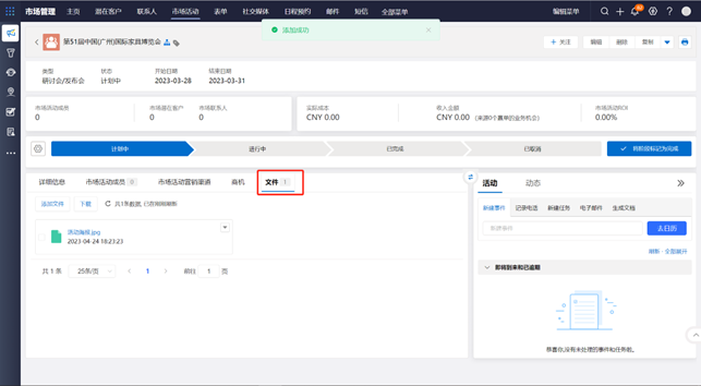 活動的一些物料如宣傳海報,宣傳手冊等文件可以上傳至係統中關聯市場活動並永久保存