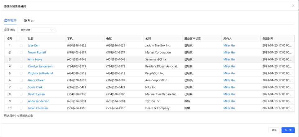 第二步:添加市場活動成員 市場部準備邀約一批老客戶及潛在客戶參加本次活動,通過CloudCC CRM選擇此次活動的目標受眾人群。市場專員在係統中選擇名稱為 “第51屆中國(廣州)國際家具博覽會”的市場活動記錄,選擇“市場活動成員”相關列表進行添加活動成員,可添加潛在客戶或者是已有客戶 的聯係人。
