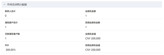 市場專員可隨時進入係統查看此次市場活動的統計數據,如獲得的潛在客戶數量、業務機會數量、業務機會金額、贏單的業務機會金額、投資回報率(ROI)等。
